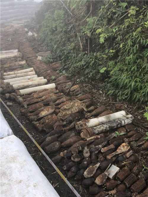 掃雷四隊官兵在天保口岸四號洞雷場排除的部分地雷和爆炸物。黃巧/攝