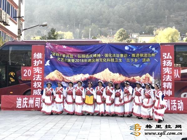 演出在舞蹈《歡慶》中拉開序幕,迪慶州憲法宣傳演出隊表演了《感恩》《扎西德勒》《一個都不能少》《熱巴》等18個歌舞及普法小品。