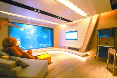 在水下復(fù)式套房里,首層設(shè)有接近深坑水面的戶外露臺(tái)和臥室,起居室則位于水面以下,這里就像水族館,坐在房間里,可以看到各種魚兒從眼前游過。酒店里還設(shè)有被水族館環(huán)抱的特色餐廳,就像在五彩斑斕的海底世界用餐。