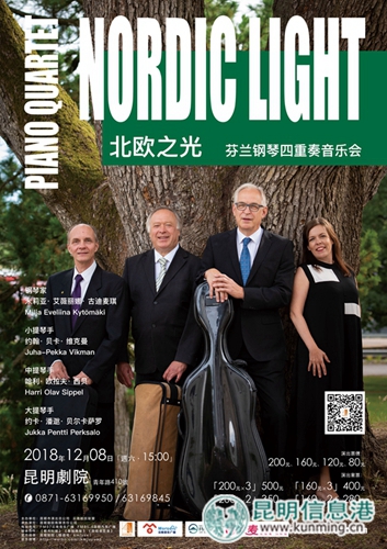 昆明信息港訊 記者陳盈盈 12月8日下午3點(diǎn),來自芬蘭的四位古典音樂大師,將為昆明觀眾帶來鋼琴弦樂四重奏演出,奏響浪漫空靈的《北歐之光》。