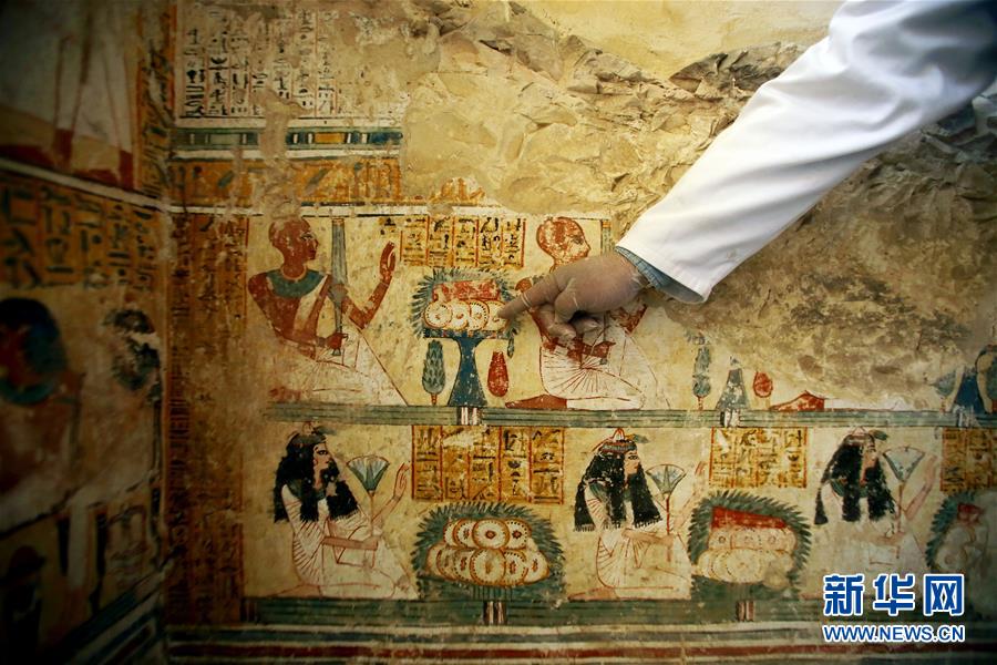 這是在埃及盧克索省尼羅河西岸新發(fā)現(xiàn)的古埃及貴族墓葬中的壁畫(11月24日攝)。