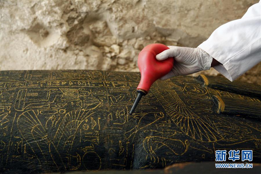 11月24日,在埃及盧克索省,工作人員在墓室內(nèi)打開一口裝有木乃伊的棺材。