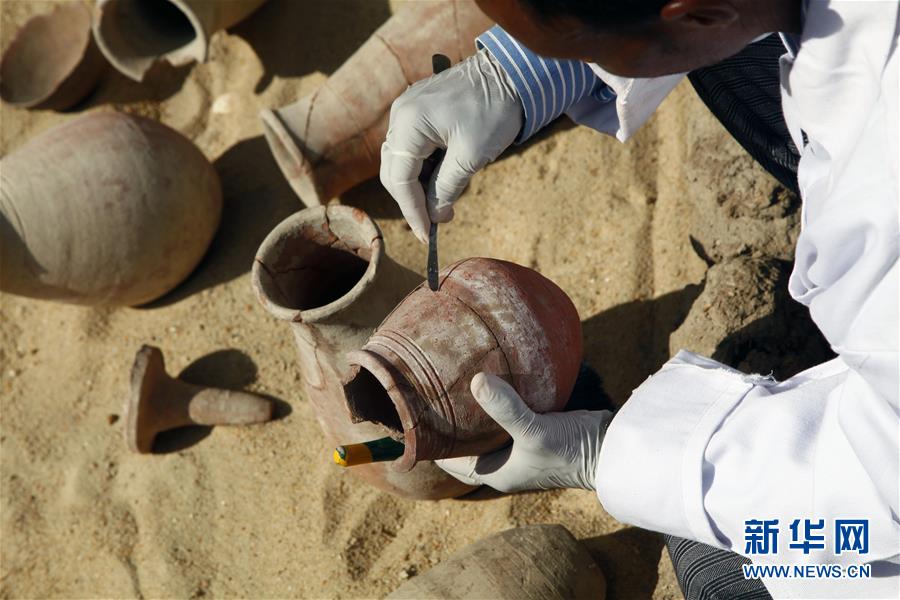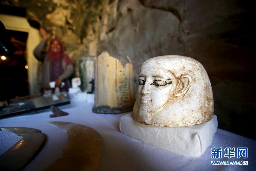 這是在埃及盧克索省尼羅河西岸新發(fā)現(xiàn)的古埃及貴族墓葬中出土的文物(11月24日攝)。
