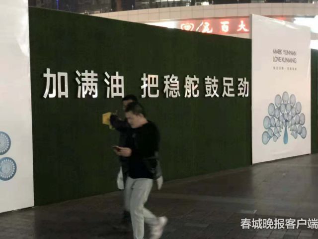 再向南屏街方向深入,“擼起袖子加油干”“加滿油 把穩(wěn)舵 鼓足勁”“要幸福就要奮斗”“Better Kunming Better World ”等等立體標(biāo)語(yǔ),再配以石林、元陽(yáng)梯田、梅里雪山等云南景觀燈箱,一路走過(guò)令人感覺(jué)很“燃”,怪不得一面圍擋會(huì)不時(shí)吸引著三五行人停下腳步自拍一番。