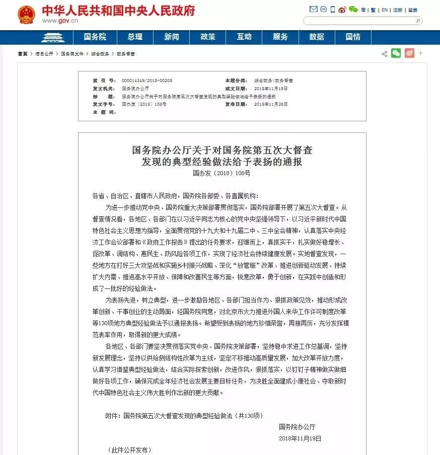 今日,中國(guó)政府網(wǎng)發(fā)布《國(guó)務(wù)院辦公廳關(guān)于對(duì)國(guó)務(wù)院第五次大督查發(fā)現(xiàn)的典型經(jīng)驗(yàn)做法給予表?yè)P(yáng)的通報(bào)》(國(guó)辦發(fā)〔2018〕108號(hào))(以下簡(jiǎn)稱《通報(bào)》)。《通報(bào)》表示從督查情況看,各地區(qū)、各部門在以習(xí)近平同志為核心的黨中央堅(jiān)強(qiáng)領(lǐng)導(dǎo)下,以習(xí)近平新時(shí)代中國(guó)特色社會(huì)主義思想為指導(dǎo),全面貫徹黨的十九大和十九屆二中、三中全會(huì)精神,認(rèn)真落實(shí)中央經(jīng)濟(jì)工作會(huì)議部署和《政府工作報(bào)告》提出的任務(wù)要求,迎難而上,真抓實(shí)干,扎實(shí)做好穩(wěn)增長(zhǎng)、促改革、調(diào)結(jié)構(gòu)、惠民生、防風(fēng)險(xiǎn)各項(xiàng)工作,實(shí)現(xiàn)了經(jīng)濟(jì)社會(huì)持續(xù)健康發(fā)展。實(shí)地督查發(fā)現(xiàn),一些地方在打好三大攻堅(jiān)戰(zhàn)和實(shí)施鄉(xiāng)村振興戰(zhàn)略、深化“放管服”改革、推進(jìn)創(chuàng)新驅(qū)動(dòng)發(fā)展、持續(xù)擴(kuò)大內(nèi)需、推進(jìn)高水平開(kāi)放、保障和改善民生等方面,銳意改革,勇于創(chuàng)新,在實(shí)踐中創(chuàng)造和形成了一批好的經(jīng)驗(yàn)做法。