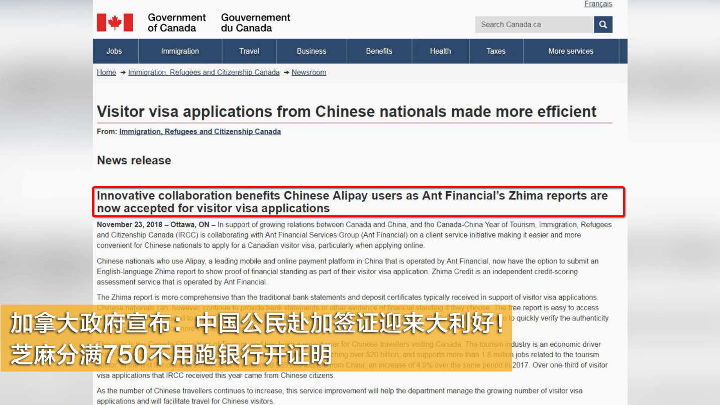 加拿大移民部(IRCC)近日在官網(wǎng)宣布,中國(guó)游客可以自主選擇提交芝麻信用簽證報(bào)告,用作財(cái)務(wù)及履約能力證明,以此來(lái)方便中國(guó)公民申請(qǐng)加拿大簽證。