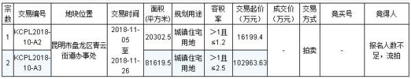 今日流拍地塊原定于本周三(11月28日)進行網上拍賣。截止到今日下午15時報名結束時,由于報名人數不夠,土地提前宣布流拍。流拍地塊編號為KCPL2018-10-A2、KCPL2018-10-A3,土地位于盤龍區(qū)青云街道,地塊面積約152畝,起拍價約為11.9億元。