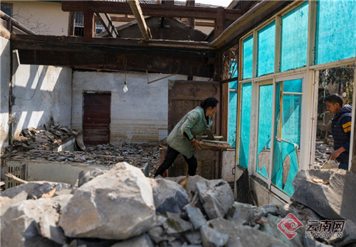 曾經(jīng)溫馨的家現(xiàn)在只剩下殘缺的空架子,建華夫婦在廢墟之中搬運(yùn)著木料,將還能利用的東西收拾出來(lái)。