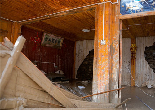 被洪水侵襲過(guò)的屋子,白色墻面已經(jīng)脫落,石頭裸露在外面。由于屋內(nèi)積滿了厚重的淤泥,村民們只好用簸箕拖著將淤泥拉出屋外。
