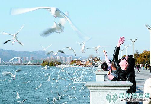 紅嘴鷗吸引了不少游客。記者李海曦?cái)z