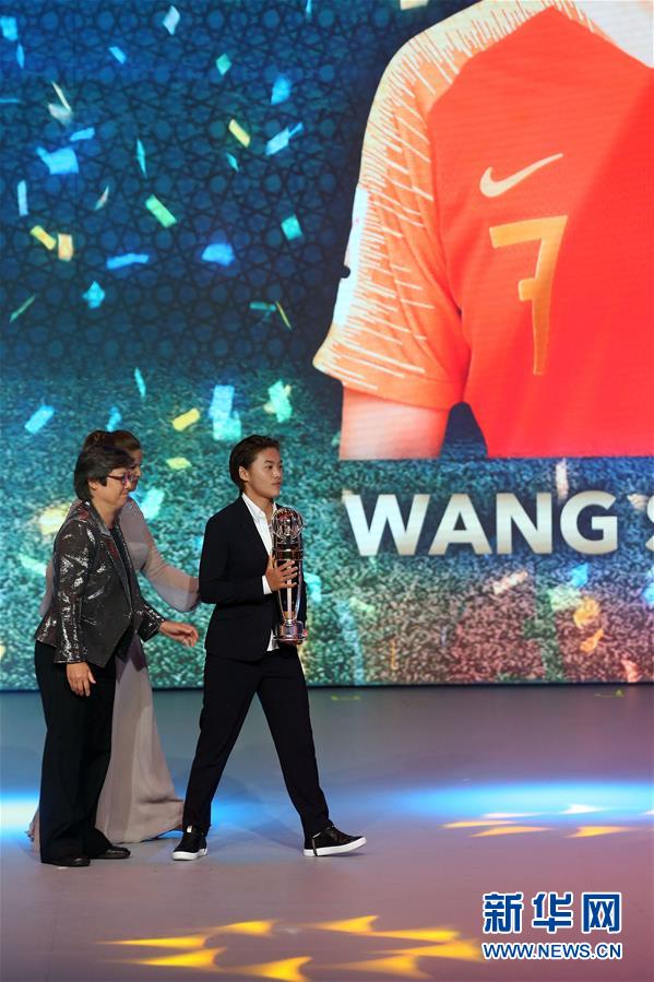 11月28日,王霜(右)在頒獎典禮上接過亞洲足球小姐獎杯。 當(dāng)日,在阿曼馬斯喀特舉行的2018年亞足聯(lián)年度頒獎典禮上,中國球員王霜當(dāng)選亞洲足球小姐。新華社/法新