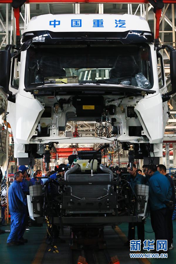 工人在中國重汽集團(tuán)濟(jì)寧商用車總裝生產(chǎn)線上裝配汽車(11月22日攝)。 新華社發(fā)(李明放/攝)