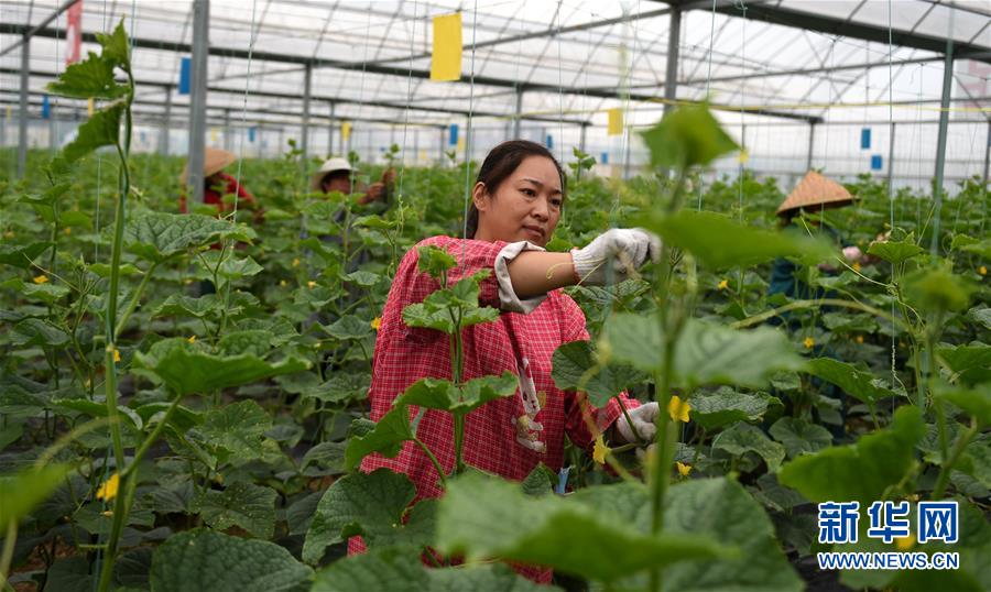在河南新蔡縣磚店鎮(zhèn),一位村民在產(chǎn)業(yè)扶貧基地黃瓜溫棚里勞動(9月10日攝)。新華社發(fā)(宋超喜/攝)