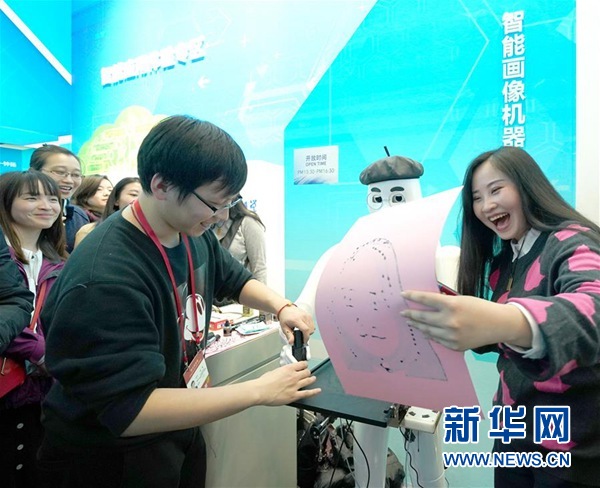 ↑11月29日,一位參觀者在看到智能畫像機器人為自己“創(chuàng)作”的畫像后開懷大笑。當日,在北京國家博物館舉行的“偉大的變革——慶祝改革開放40周年大型展覽”迎來參觀高峰,單日觀眾人數(shù)超過5萬人次。 新華社記者陳建力/攝