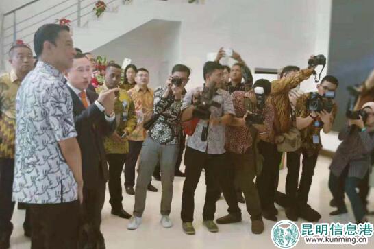 盧敏放向印尼投資協(xié)調(diào)委員會主席Thomas Lembong介紹工廠情況,當?shù)孛襟w高度關注