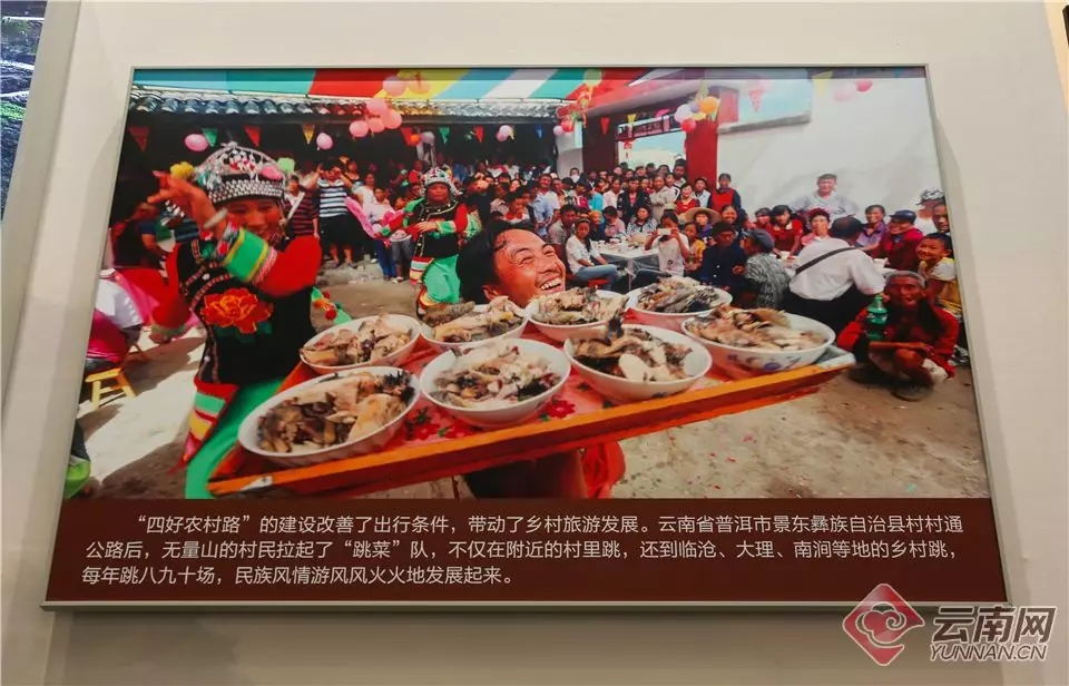 在大國氣象展區(qū)基礎(chǔ)設(shè)施建設(shè)突飛猛進(jìn)的展出單元里,展出了一張?jiān)颇鲜∑斩芯皷|彝族自治縣村村通公路后,無量山村民組建的跳菜隊(duì)在喜事現(xiàn)場擎起“8大碗”熱熱鬧鬧跳菜的照片。