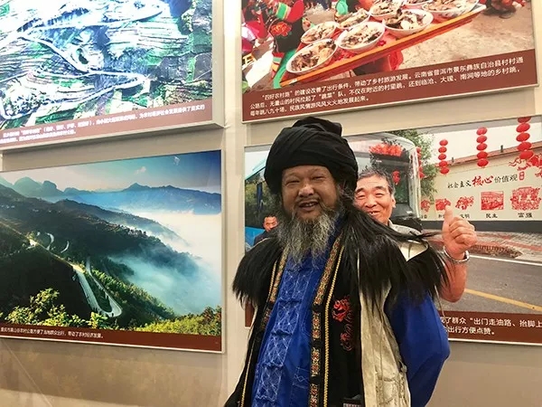 56歲的彝族跳菜表演藝術(shù)家阿本枝,也是在這一天走進(jìn)展區(qū)的。但他不僅是來參觀,他還帶著更重要的任務(wù)——來到展出了彝族跳菜照片的展區(qū),透過講解跳菜技藝,讓大家更進(jìn)一步地了解到,改革開放給彝族人民生活帶來的變化。