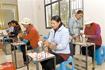 貧困群眾在家門口的扶貧工廠務(wù)工。曹振華 攝