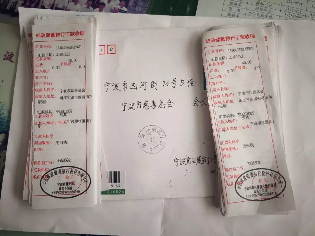2015年11月26日,從中國郵政儲蓄銀行寧波分行營業(yè)部匯款40萬元和中山西路郵政大廈匯款45萬元,落款“然順”,地址:寧波市人民路1號。用于資助2016年大學(xué)新生170名,其中江東、海曙、江北各30名,余姚、象山各41名。