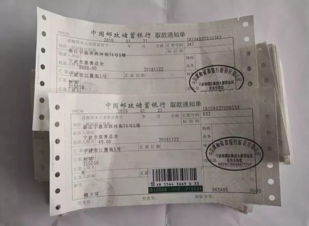 11月23日上午10點30分左右,寧波市慈善總會工作人員收到郵局送來的51張取款通知單(其中9999元50張、50元1張),合計50萬元,取款單上顯示匯款人為“然其”。這次是“順其自然”第20次捐款,已累計捐款1005萬元。