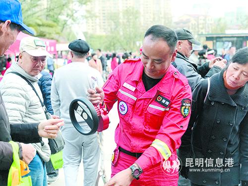 ?云南陸搜救援隊隊員向市民展示高樓救生緩降器。記者李雙雙/攝