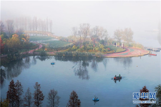 當(dāng)日,貴陽市出現(xiàn)大霧天氣,閱山湖公園內(nèi)的霧氣、林木、湖水呈現(xiàn)出一幅美麗的冬日畫卷。 。新華社記者 劉續(xù)/攝