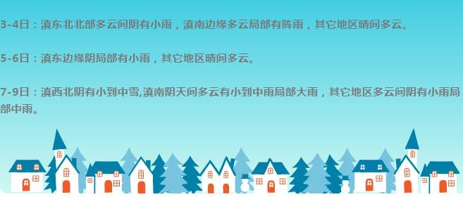 受南支槽和冷空氣影響,7-9日我省大部地區(qū)日最高氣溫將下降2~4℃。其中,滇南有小到中雨局部大雨天氣,滇西北將有小到中雪。