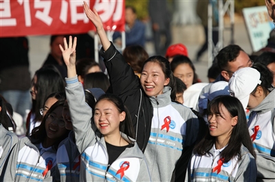 防艾主題宣傳活動(dòng)中志愿者進(jìn)行防艾知識(shí)搶答 范南丹/攝 ?