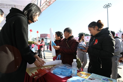 工作人員向群眾發(fā)放防艾宣傳資料 范南丹/攝 ?