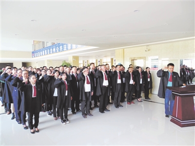 ?儀式上,全體律師齊唱國歌,向憲法和國旗莊嚴(yán)宣誓。