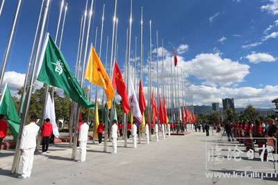 ?下午14時(shí)30分,升旗儀式開(kāi)始。鮮艷的五星紅旗在雄壯的國(guó)歌聲中徐徐升起,伴隨著云南省第十一屆民族運(yùn)動(dòng)會(huì)會(huì)歌,旗手升起了云南省第十一屆少數(shù)民族傳統(tǒng)體育運(yùn)動(dòng)會(huì)會(huì)旗和各代表團(tuán)團(tuán)旗。