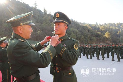 昆明信息港訊 記者叢林 通訊員葉熙 12月4日,武警昆明支隊(duì)隆重舉行2018年度新兵授銜暨宣誓儀式,數(shù)百名新兵被光榮授予武警列兵警銜。授銜后,新戰(zhàn)友在鮮紅肩章的映襯下,高舉右拳,進(jìn)行了莊嚴(yán)宣誓,抒發(fā)了永遠(yuǎn)做黨和人民忠誠(chéng)衛(wèi)士的豪邁決心。