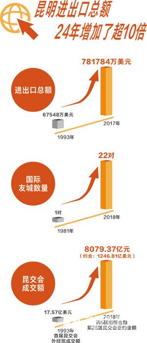 改革開放40年來,在黨的堅強領(lǐng)導(dǎo)下,昆明逐漸從我國對外開放的“末梢”變?yōu)椤扒把亍薄?981年11月,昆明與日本藤澤市締結(jié)為首對友好城市。自此,昆明的“朋友圈”越來越大,截至目前已締結(jié)國際友城22對、友好交流城市17對。1993年,昆明開始有進出口統(tǒng)計,當年,全市進出口總額為67548萬美元;2017年,全市進出口總額達781784萬美元,是1993年的11.58倍……