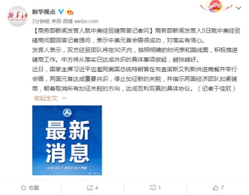 商務(wù)部新聞發(fā)言人5日就中美經(jīng)貿(mào)磋商問題回答記者提問,表示中美元首會晤很成功,對落實(shí)有信心。
