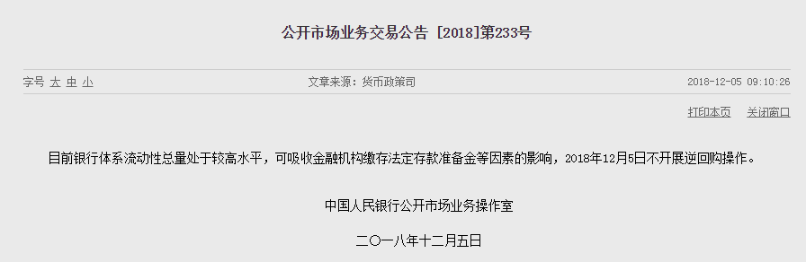 12月5日,央行發(fā)布公告稱,目前銀行體系流動(dòng)性總量處于較高水平,可吸收金融機(jī)構(gòu)繳存法定存款準(zhǔn)備金等因素的影響,當(dāng)日不開展逆回購(gòu)操作。