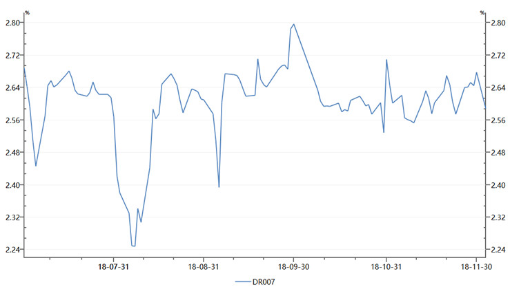 11月以來(lái)公開市場(chǎng)到期壓力較小,年底財(cái)政支出力度也在加大,銀行體系流動(dòng)性總量仍處于合理充裕水平,市場(chǎng)利率表現(xiàn)平穩(wěn)。