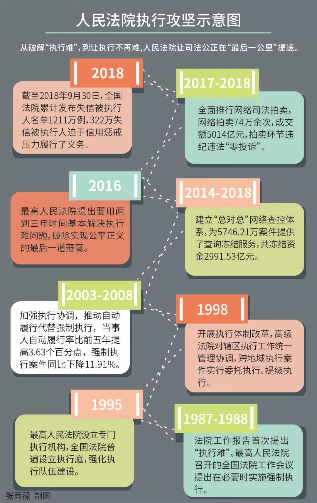 1988年最高人民法院工作報(bào)告中“執(zhí)行難”三個(gè)字第一次出現(xiàn)在公眾視野中,人民法院滿懷勇氣與擔(dān)當(dāng),踏上了攻堅(jiān)執(zhí)行難的征程。