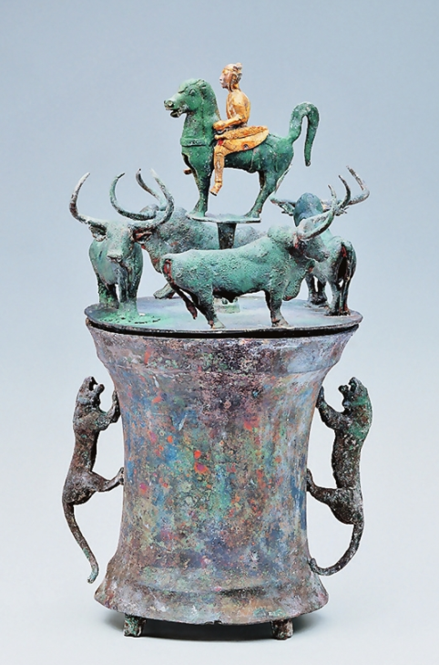 省博物館入選的3件國家寶藏的關(guān)鍵詞分別為“聲”“青銅”“天龍八部”?!奥暋痹谑〔┪镳^的眾多館藏文物中,具有重要意義,它是中華人民共和國國歌的作曲者聶耳使用過的小提琴?!扒嚆~”講述的是貯貝器的故事。貯貝器是古滇國特有的青銅器,具有濃郁的地方特色和民族風(fēng)格,大多用來貯存貝幣,相當(dāng)于我們今天的存錢罐。同時(shí),貯貝器也是象征權(quán)貴地位、祭祀祖先的重要器物。四牛鎏金騎士銅貯貝器為典型的束腰圓筒形的貯貝器,器腰兩側(cè)各裝飾一個(gè)虎形耳,虎作向上攀爬狀,細(xì)節(jié)刻畫極其逼真。器物蓋上有4只體格健碩的牛逆時(shí)針圍繞中心作奔跑狀,而中心有一個(gè)圓柱柄托盤,托盤上有一個(gè)騎著高頭大馬的騎士人物形象??v觀該貯貝器,最為顯眼的當(dāng)屬鎏金騎士。鎏金騎士位于整個(gè)器物中間位置,為當(dāng)時(shí)古滇國貴族武士形象?!疤忑埌瞬俊眲t介紹大理國銀鎏金鑲珠金翅鳥。出土于大理崇圣寺千尋塔,金翅鳥梵名為“迦樓羅”,被尊為大理的保護(hù)神,是佛教護(hù)法中的天龍八部。整器鎏金,顯得珠光寶氣,雍容華貴。(云南日?qǐng)?bào) 記者李悅春)