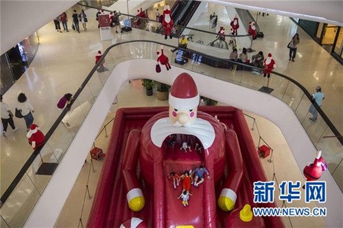 ↑12月9日,在泰國曼谷的一家商場,人們在一個(gè)充氣的圣誕老人裝飾上玩耍。 新華社/法新