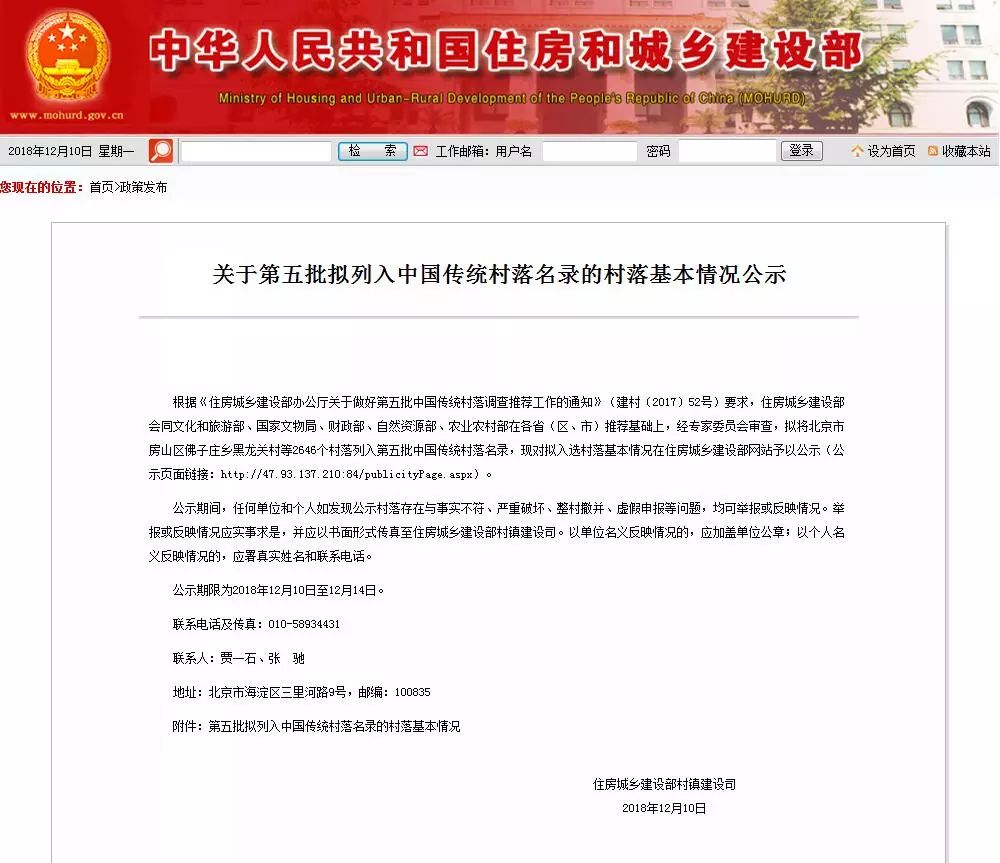 公示期限為2018年12月10日至12月14日。公示期間,任何單位和個人如發(fā)現(xiàn)公示村落存在與事實不符、嚴重破壞、整村撤并、虛假申報等問題,均可舉報或反映情況。