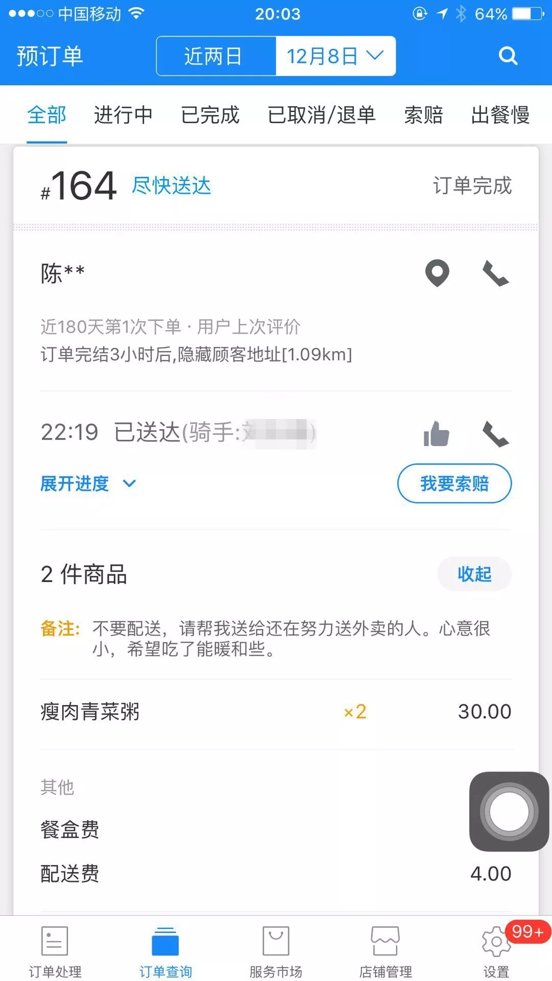 “不要配送,請幫我送給還在努力送外賣的人。心意很小,希望吃了能暖和些?!币咽峭砩?1點,快打烊的文三西路曼玲粥店,老板娘接到這樣一個特別的外賣訂單,點了兩份瘦肉青菜粥。