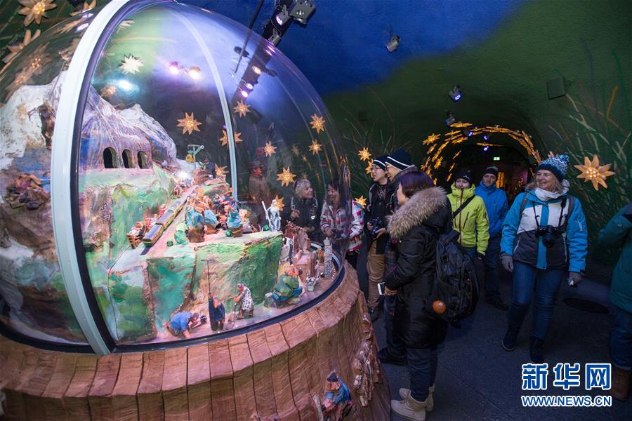 幾名中國游客在瑞士中部伯爾尼州因特拉肯地區(qū)的少女峰景區(qū)超級冰宮內(nèi)游覽(2017年12月7日攝)。新華社記者徐金泉攝