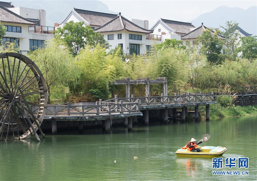 物業(yè)公司的工作人員在安吉縣天荒坪鎮(zhèn)余村進(jìn)行河道清潔(2017年8月4日攝)。自2010年起,浙江省安吉縣開始探索將物業(yè)公司引入農(nóng)村,對村莊保潔、河道清潔、綠化養(yǎng)護(hù)、文體設(shè)施維護(hù)進(jìn)行專業(yè)管理。新華社記者 翁忻旸 攝