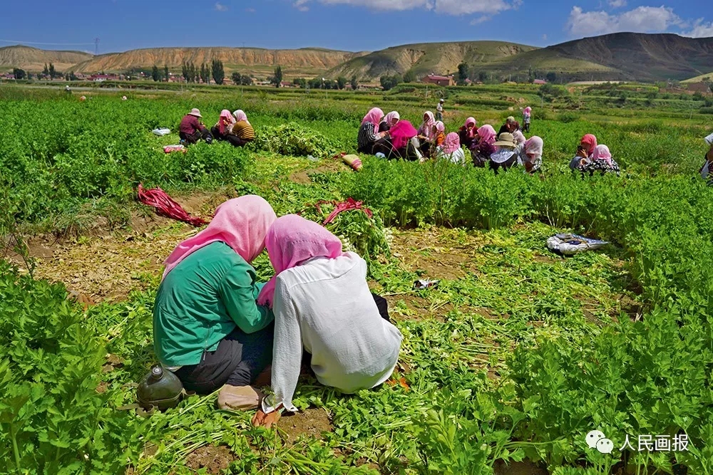 寧夏固原市,一片芹菜田里,勞作間隙,收菜的婦女們?cè)谛菹ⅰ?攝影 鄔志斌