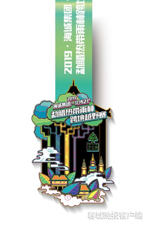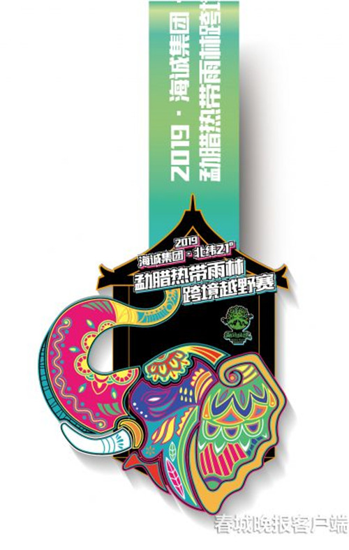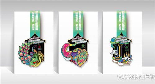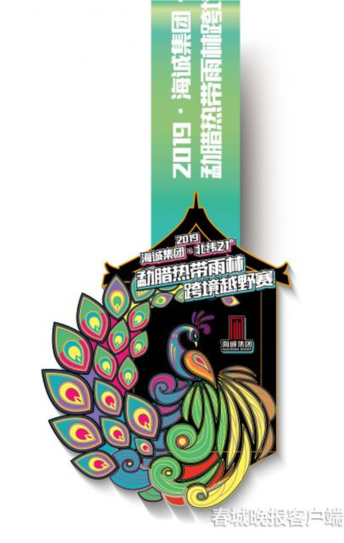 獎(jiǎng)牌:金色描邊的竹樓前是賽事冠名商“海誠集團(tuán)”logo,孔雀展開五彩斑斕的羽翼,外圈是翠綠和靛藍(lán),內(nèi)圈是金黃,橙色和桃紅點(diǎn)綴期間,巨大的“孔雀眼”讓人無法移開視線??兹肝⑽⒌紫虏鳖i,迎接國際跑步愛好者的到來。