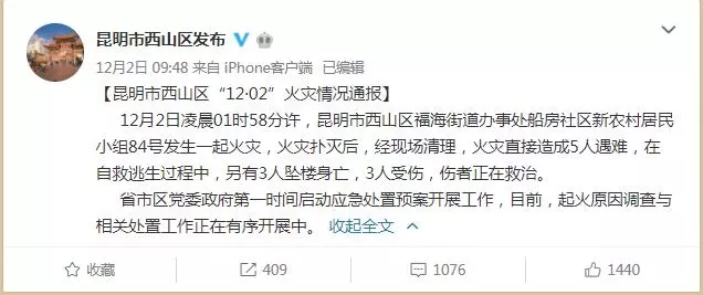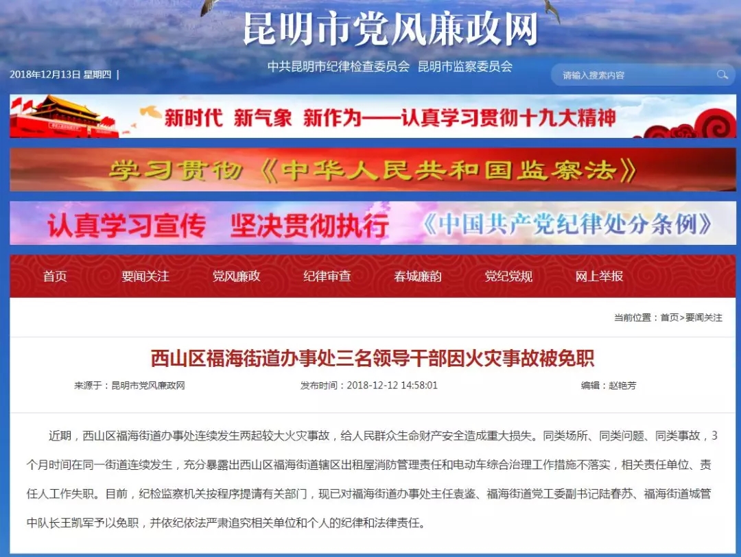 昆明信息港訊 12月12日,昆明市黨風廉政網(wǎng)發(fā)布西山區(qū)福海街道辦事處三名領導干部因火災事故被免職的消息。