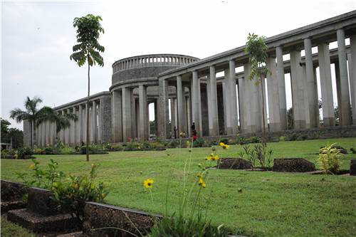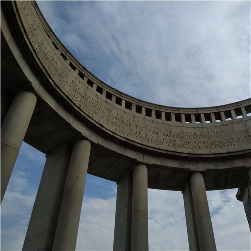 在墓地的圓形建筑上用英文刻著“1939-1945這里記錄著27,000名在英國(guó)皇家軍隊(duì)服役的來(lái)自許多民族的士兵的名字,他們?cè)诰挼楹桶⑺_姆(印度東北一個(gè)邦)戰(zhàn)斗中獻(xiàn)出了自己的生命。由于他們都成為了戰(zhàn)爭(zhēng)的遺產(chǎn)保留在這里,并不一定按照各自的民族習(xí)俗埋葬,死后他們都是同志。他們是為自由而戰(zhàn)。”同時(shí)也用緬文、印度文、烏爾都文和果魯穆奇文(旁遮普)題寫碑銘。