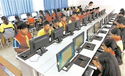 2016年12月,云南省政府發(fā)文提出,將逐步在人口較少民族和“直過民族”聚居區(qū)實行從學(xué)前到高中階段的14年免費教育。圖為該省普洱市西盟佤族自治縣民族小學(xué)的學(xué)生在上計算機(jī)課。新華社記者藺以光/攝