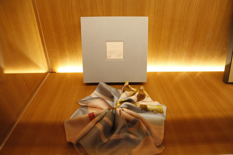 還有領(lǐng)帶、手帕、眼鏡盒、茶具、香具、U盤、鬧鐘等,涉及不同品類,共計(jì)32款。其中讓人印象深刻的是一款名為“清明上河圖·異想長(zhǎng)巾”的產(chǎn)品,其設(shè)計(jì)靈感源于《清明上河圖》,擇取卷中具有特色與趣味的部分進(jìn)行創(chuàng)作,想象力豐富的設(shè)計(jì)師將祥云、波浪、寶相花等多種傳統(tǒng)元素與清明上河圖的經(jīng)典部分相結(jié)合,輔以強(qiáng)烈的配色,呈現(xiàn)出具有藝術(shù)感的“異想”畫面,為寒冷的冬日平添一抹亮色。