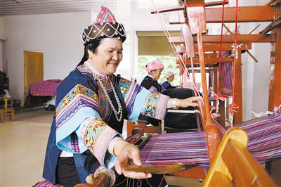 余晶鳳在織壯錦。